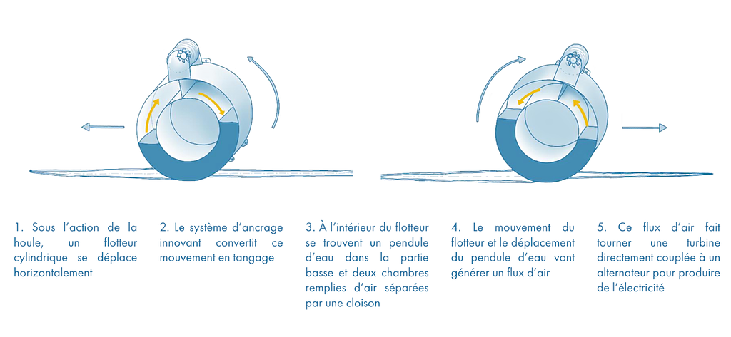 • conversion : mouvement des vagues -> mouvement horizontal du flotteur -> tangage par le système d’ancrage -> déplacement du pendule d’eau -> génération du flux d’air -> actionnement de la turbine ;
